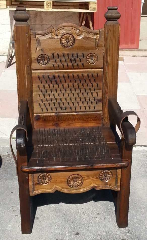 Se trata de una recreación totalmente artesanal de un sillón con multitud de pinchos y púas afilados utilizando madera antigua y hierro para construir este tipo de máquinas de tortura. Fabricadas en nuestras instalaciones de ANTIGUORINCON.COM