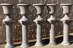 Columnas de sencillo capitel para realzar esculturas clásicas o maceteros como es el caso.