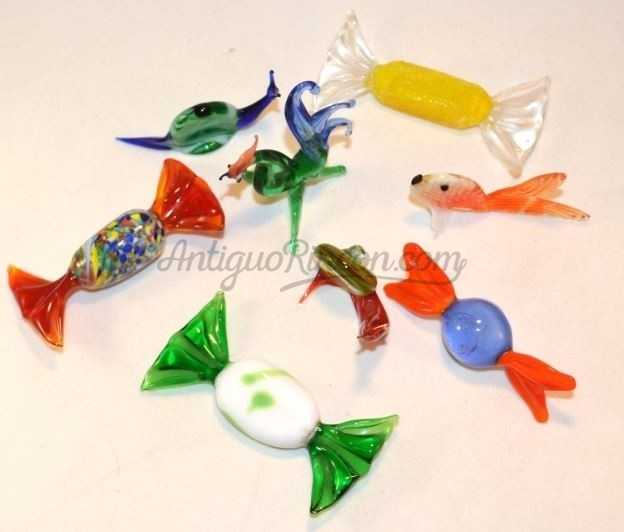 Esculturas en vidrio de Murano representando varios elementos decorativos.