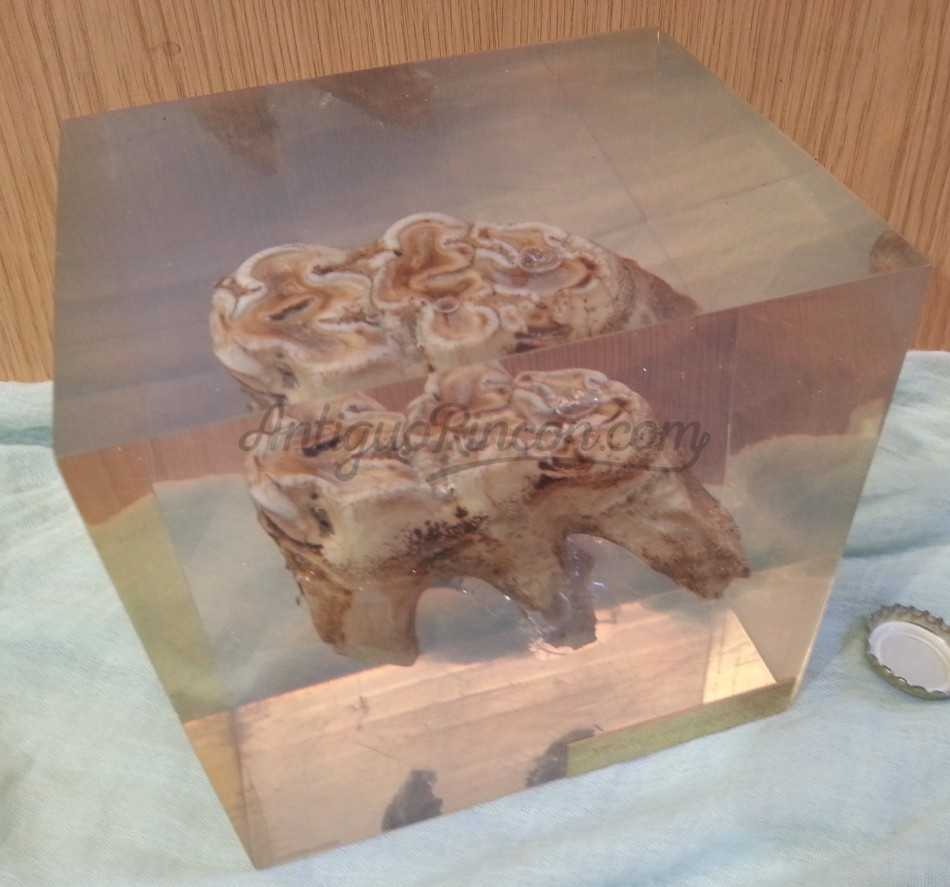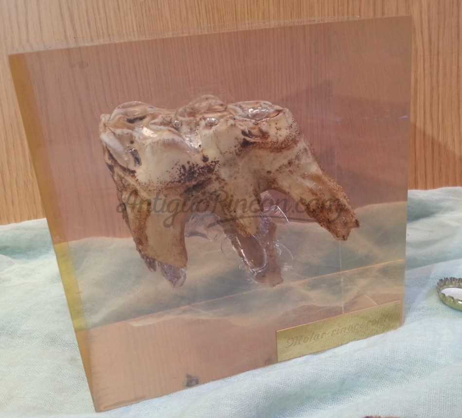 Enorme molar de rinoceronte. Pieza moderna introducida en gran y pesada placa de resina transparente para poder observarse desde todos los ángulos.