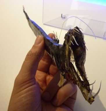 El cuerpo se ha pintado y protegido con barniz para una mejor conservación. Las aletas que parecen estropeadas por su delicada naturaleza también están protegidas con el barniz pero aún así son especialmente delicadas debido a la frágil estructura de esta especie, de modo que tenga cuidado con su manipulación. Los ojos y el filamento largo se han sustituido por artificiales.