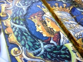 MOSAICO CENTENARIO CORDOBÉS. EN DOS PIEZAS. ESPECTACULAR: Impresionante mosaico centenario perteneciente a una vieja casa cordobesa. Compuesto por dos piezas. Representado a los Reyes Católicos Fernando e Isabel. Tal cual se puede ver en las fotos. Pieza muy pesada. Mide el conjunto 28 cm por lado con 2 cm de grueso. Ref. nº 704-R