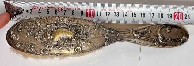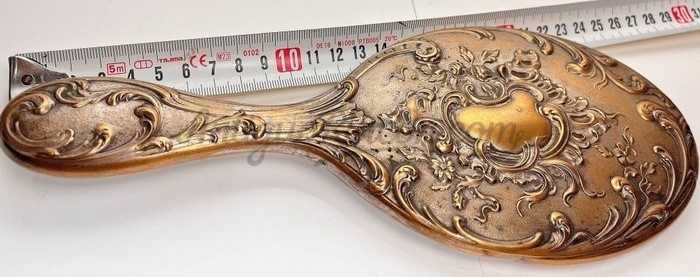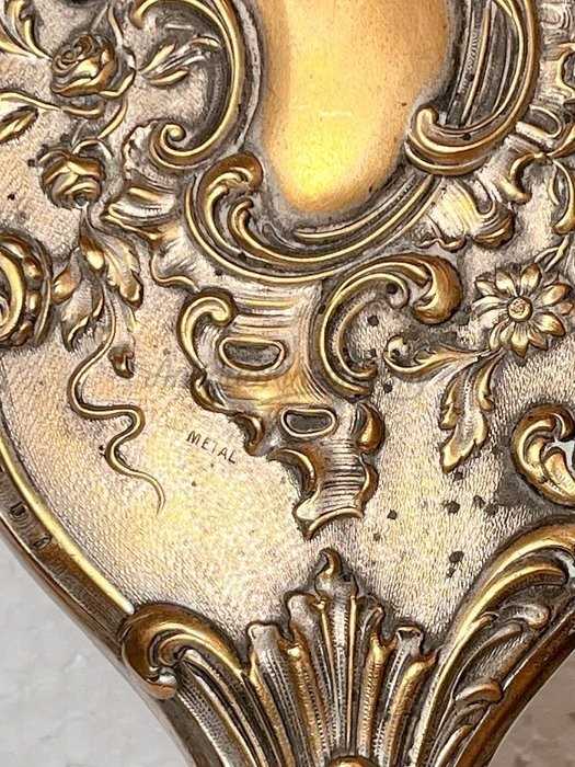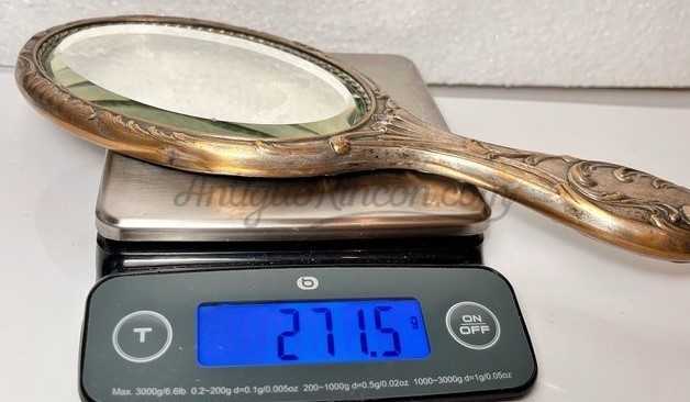 El metal lleva un baño de plata original, aplicado sobre una base de latón. Este tipo de acabado envejecido, más claro en algunos lugares y más oscuro en otros, forma parte del proceso de fabricación y realza los motivos.