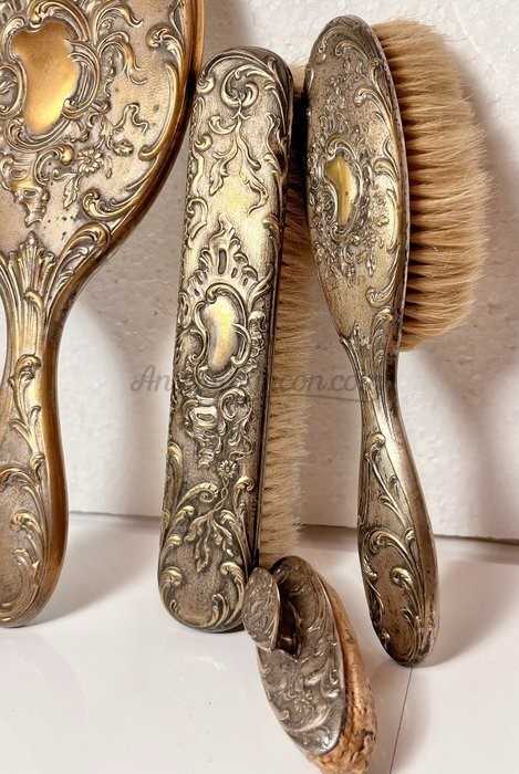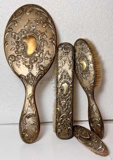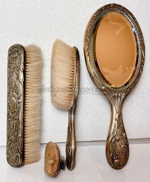 Conjunto de tocador antiguo elegante compuesto por un espejo de mano y tres cepillos a juego.