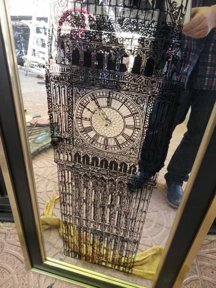 Gran espejo de 1,50 m de alto * 54 cm de ancho. Reloj a pila central, que no funciona, y gran serigrafía de La Torre de Londres. Aproximádamente de los años 90.