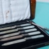 Hermoso juego de cubiertos antiguos con asidera nacarada en su aja original.