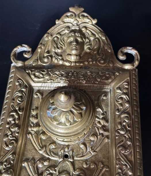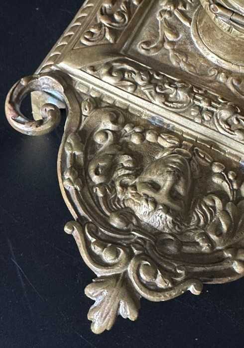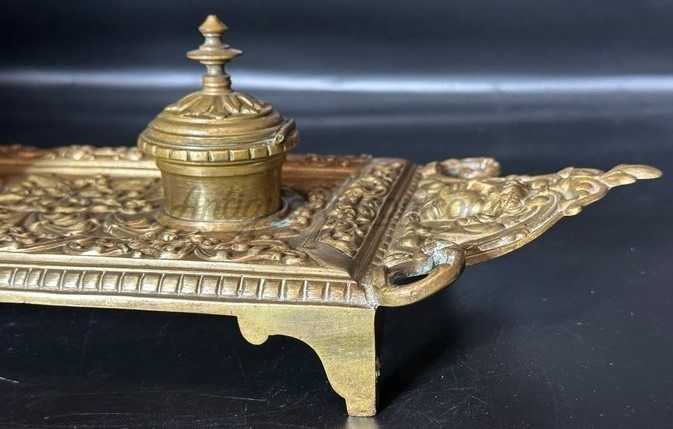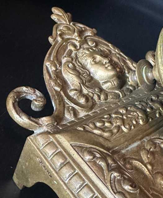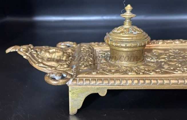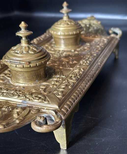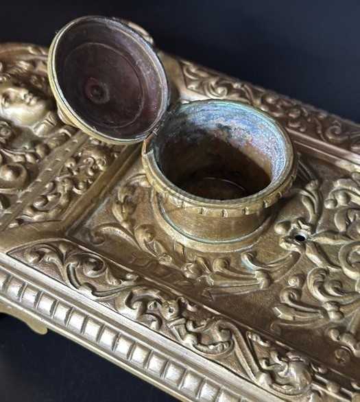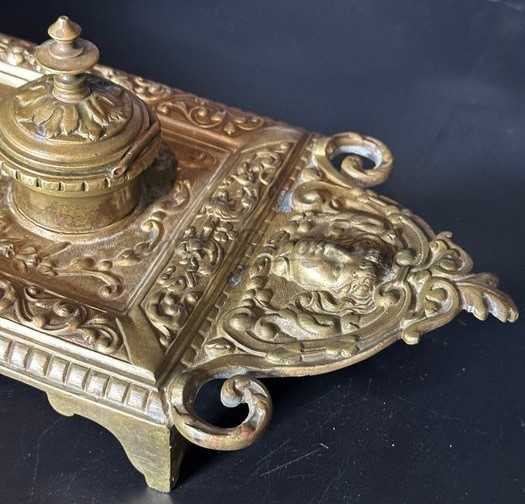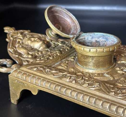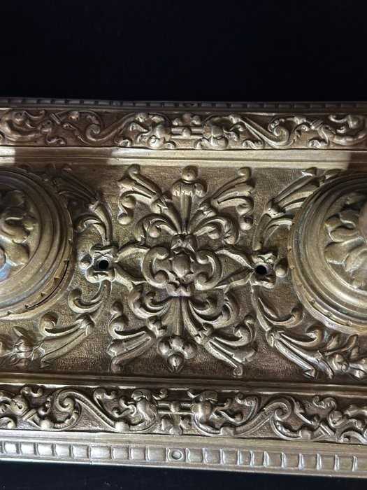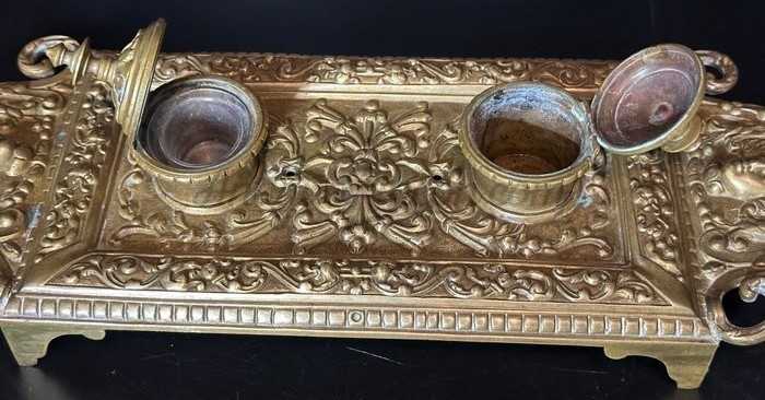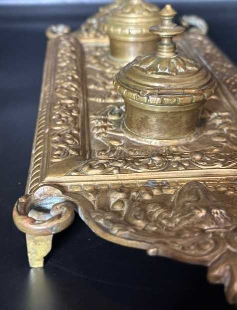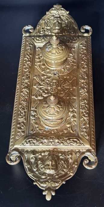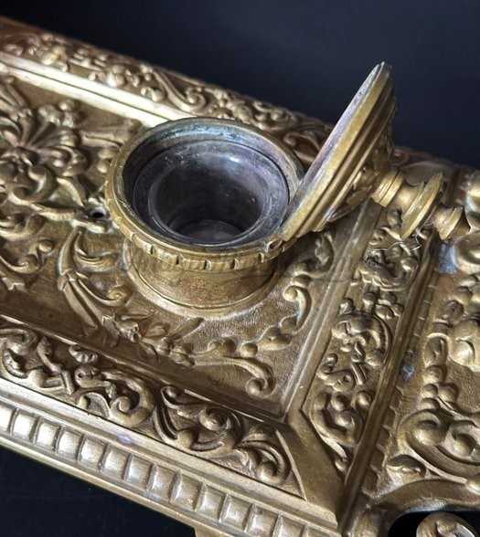Modelo con decoraciones ricas de motivos florales, volutas, follaje estilizado en relieve. Dos retornos con grotescos de estilo Renacimiento. La orla acanalada está adornada con grifos y todo ello rematado por dos encriers que se abren en pequeños cuencos de cristal intactos, con tapas decoradas con una lira y hojas de acanto.