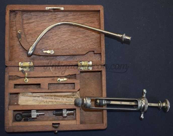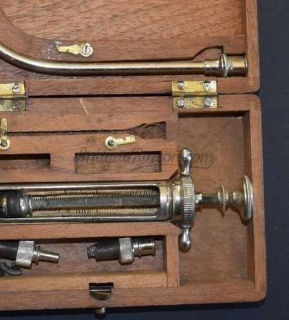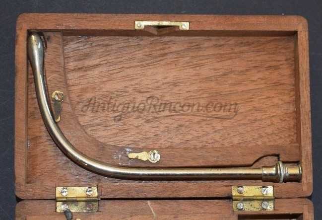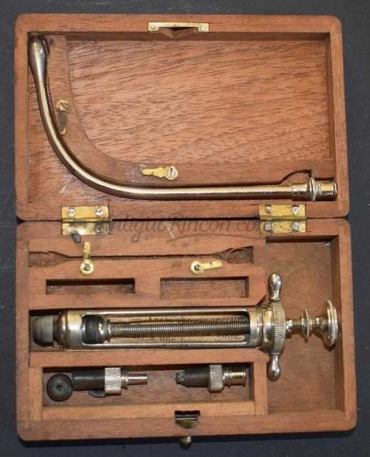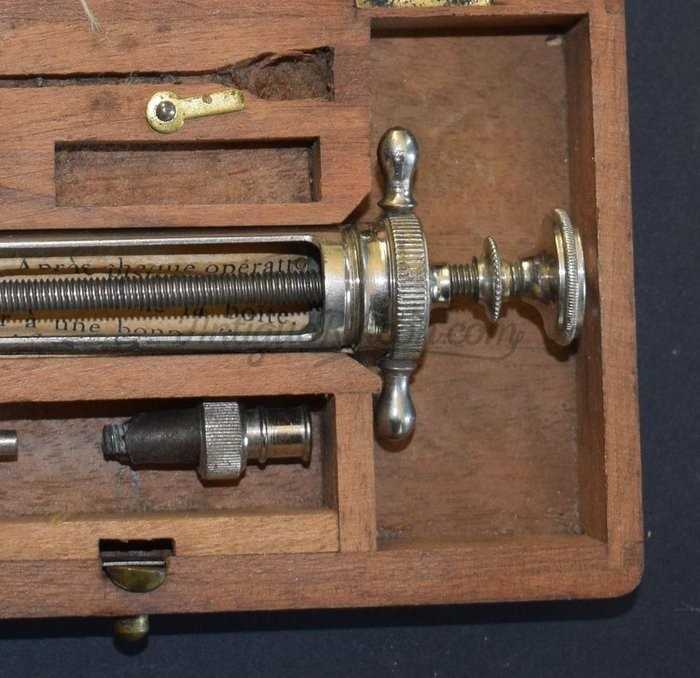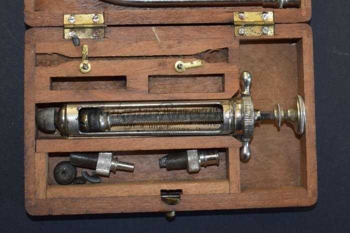 Estuche portátil de madera - 1 jeringa médica de metal - sin vidrio - con accesorios y manual de instrucciones de época.