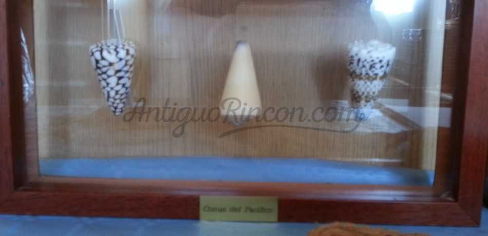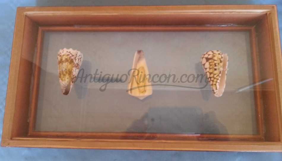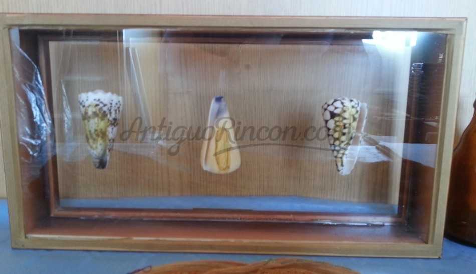 Vitrina acristalada con 3 caracolas de la especie Conus del Pacifico.