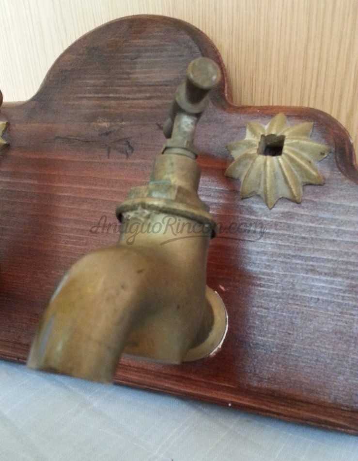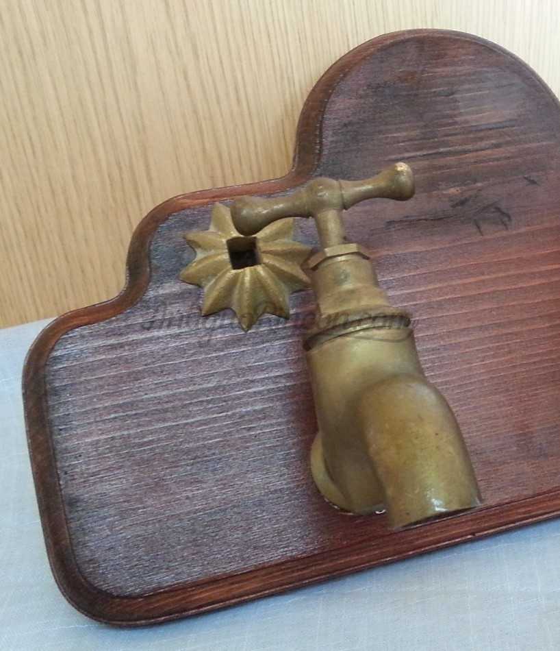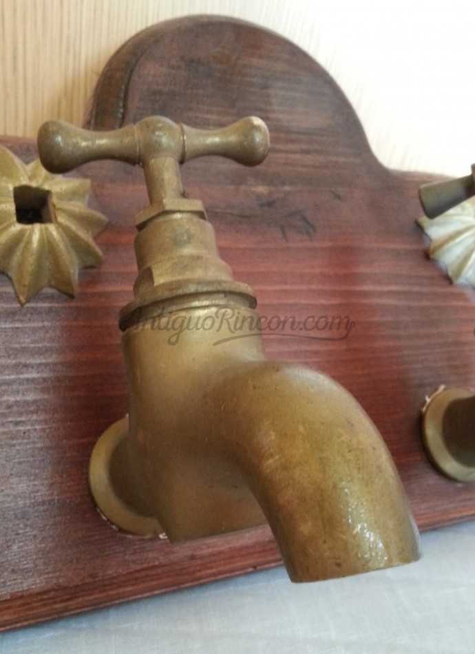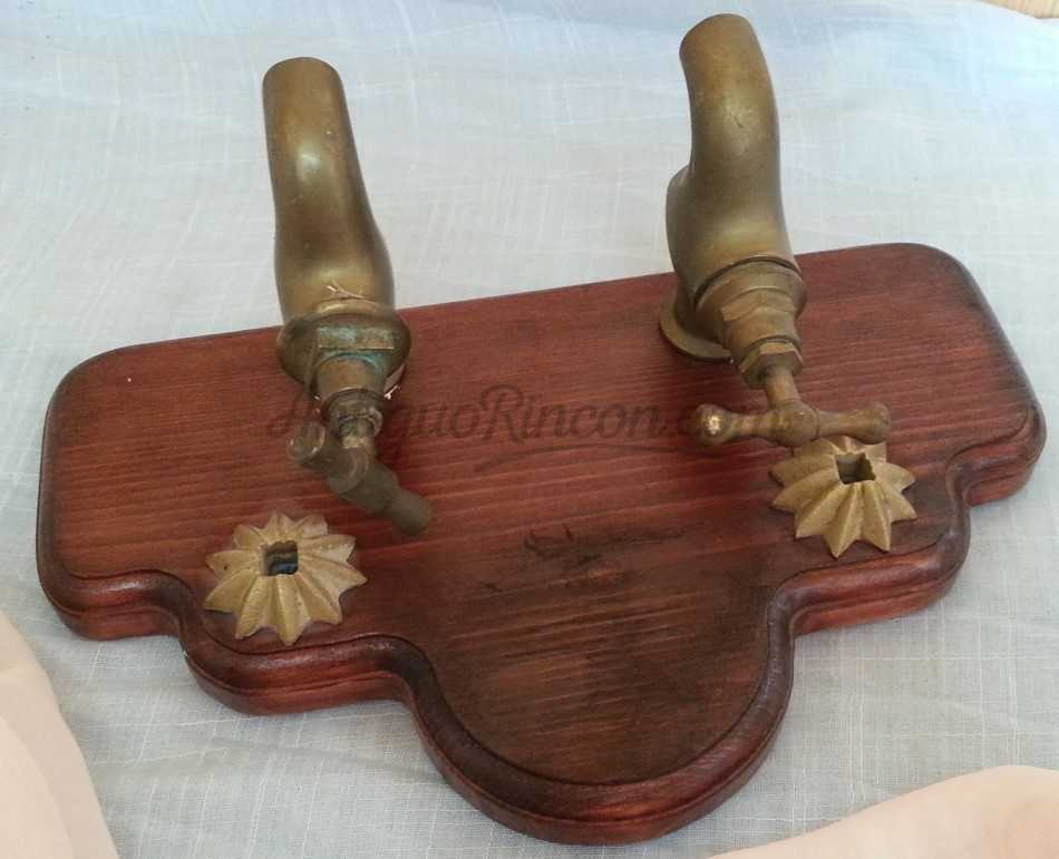 Preciosa composición de dos grifos de jardín montados sobre placa de madera para montar directamente a la pared.