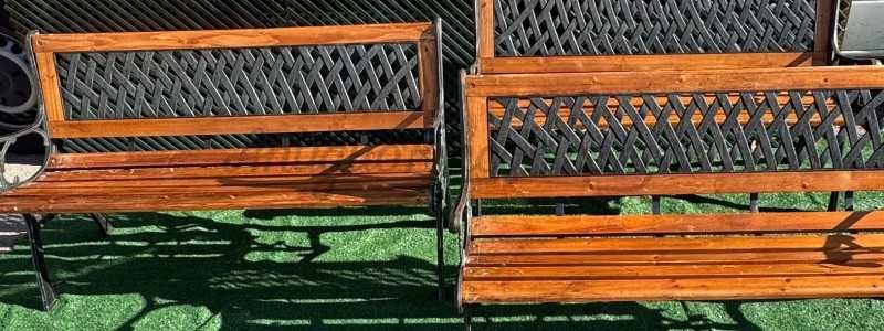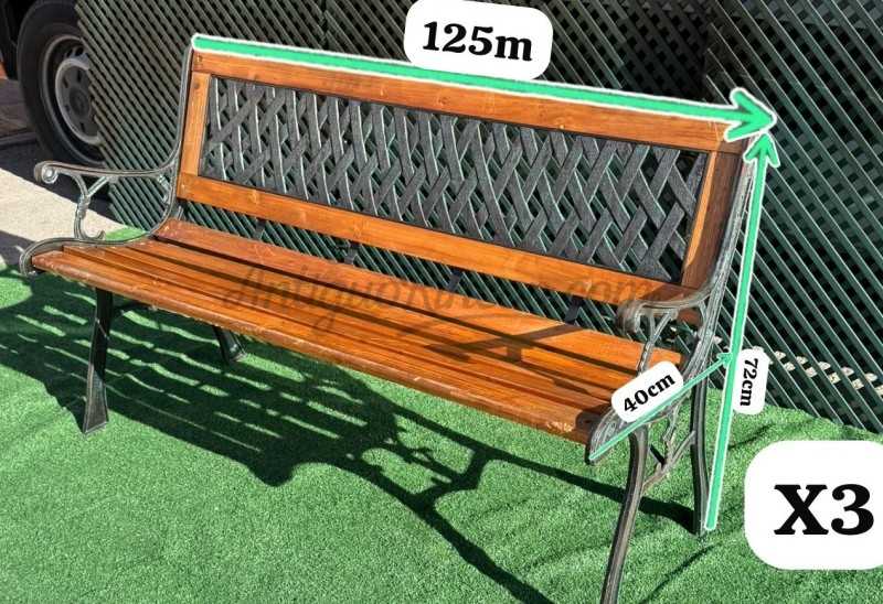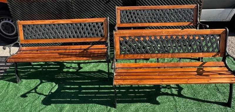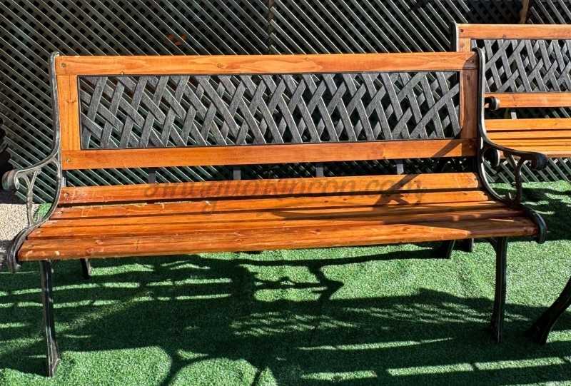 Buen estado general de estos bancos fabricados especialmente por la industria del cine en madera maciza y patas de hierro.