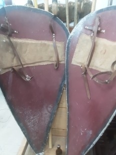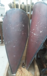 Las fotos son la mejor descripción de esta pareja de corazas que mide cada una 1,20 m de alto * 57 cm de ancho y se denominan escudos de lágrima de estilo normando enventanado en el siglo XII -XIII, ligero y funcional con agarres en cuero.