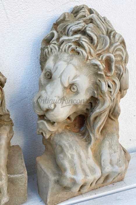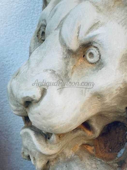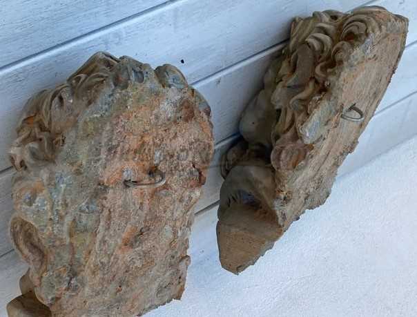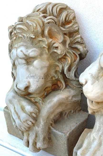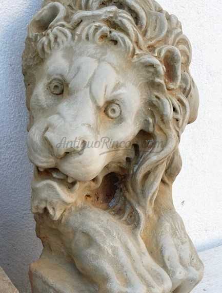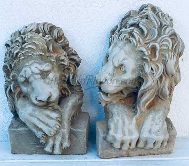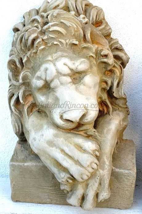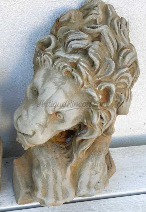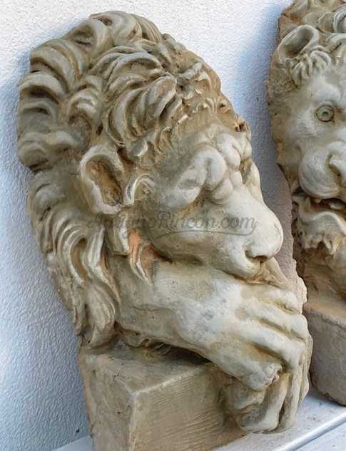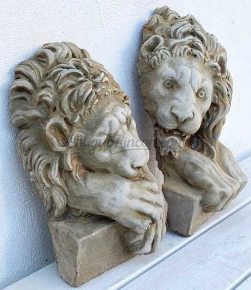 Imponentes esculturas de pared que representan cabezas de león, realizadas en arenaria fundida, con excelente definición en los detalles. El material tiene peso y consistencia iguales a la piedra verdadera, no genera polvo y es ideal también para exteriores, gracias a su resistencia natural a los agentes atmosféricos.