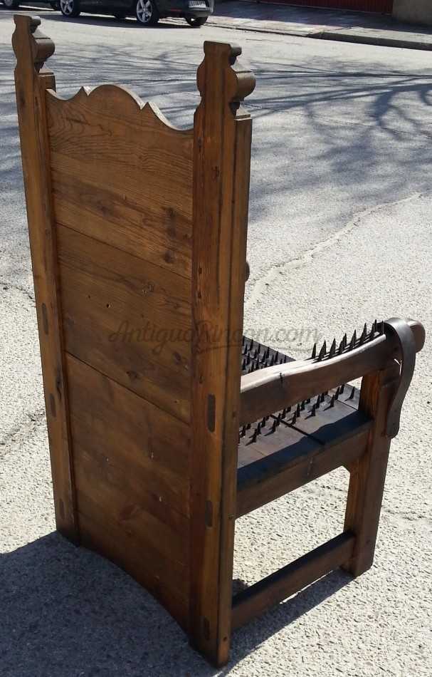 Se trata de una recreación totalmente artesanal de un sillón con multitud de pinchos y púas afilados utilizando madera antigua y hierro para construir este tipo de máquinas de tortura. Fabricadas en nuestras instalaciones de ANTIGUORINCON.COM