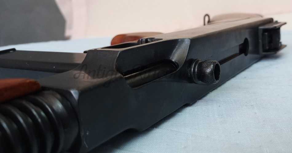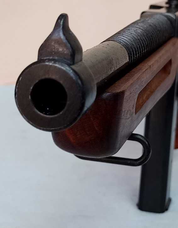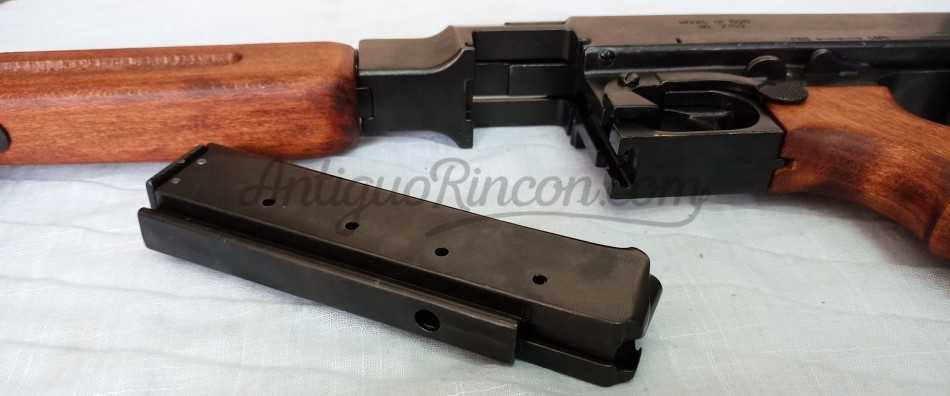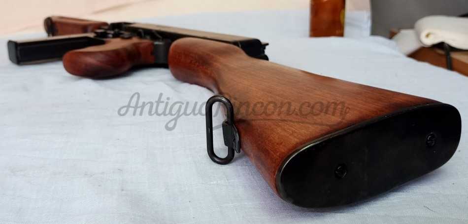 Réplica de Subfusil, fabricado en metal y madera, con mecanismo simulador de carga y disparo y cargador extraíble.