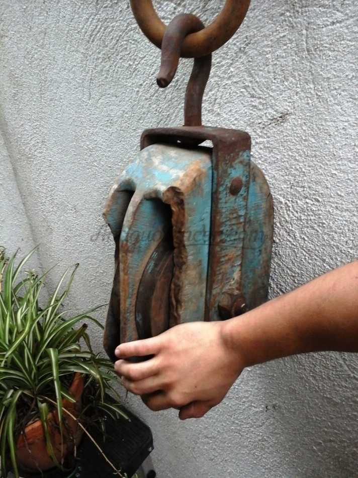 Funciona bien. Mide 45 cm de alto hasta su gancho * 15 cm de diámetro y 25 cm de profundidad. Pesa 16 kg. Le falta un trozo de hierro por unos de sus lados que no afecta a su operatividad, aunque será un fantástico objeto rústico de decoración.