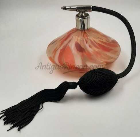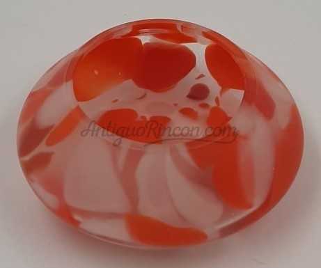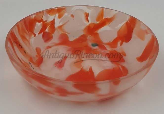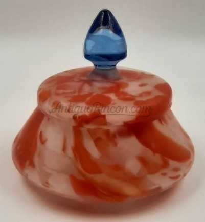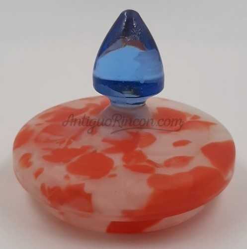 Realizado en vidrio soplado, opalino, con matices de naranja, blanco crema y azul. Porta polvo con tapa, pomo de vidrio azul transparente.